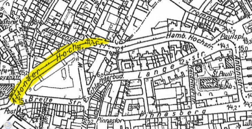 Seit 1941 oder 1942 wohnte die Familie – Frieda, Franz, Heinrich und Irmgard – in der Hamburger Hochstraße 28. Am 3. Juni 1942 kam hier ihre Tochter Käthe zur Welt. Die Hochstraße hatte bis 1938 einen Altonaer und einen Hamburger Teil. Frieda lebte mit ihrer Familie in der Hausnummer 28, die im ehemaligen Altona lag; es handelte sich um einen Hinterhof. Die genauen Wohnverhältnisse sind mir nicht bekannt.
