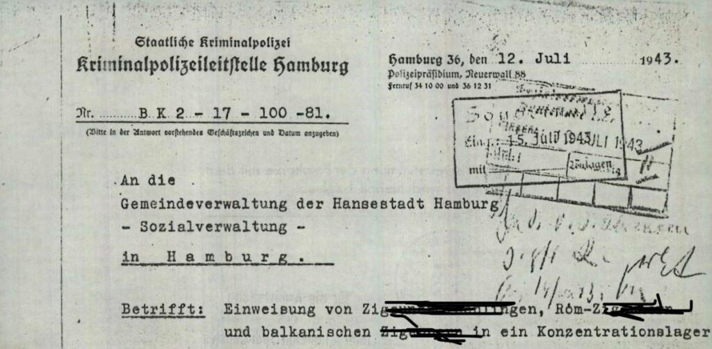Nach der rassistischen Ideologie der Nationalsozialisten galten sie – wie jüdische Menschen – als angebliche Gefahr für das „deutsche Blut“. Sie sollten in den Osten deportiert und dort vernichtet werden.